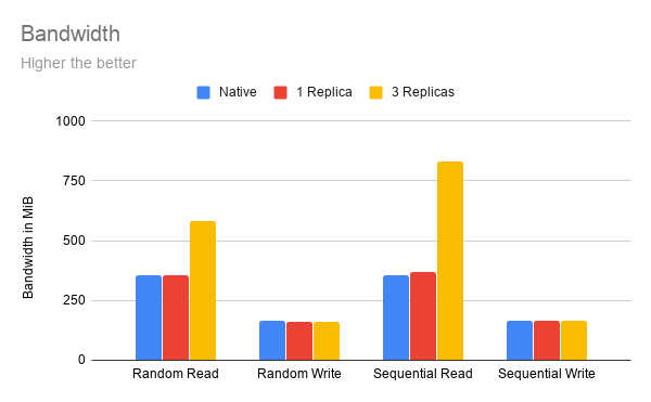 With 1 replica, Longhorn provides the same bandwidth as the native disk.