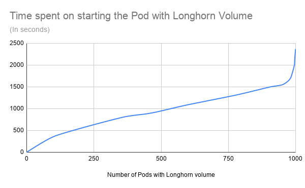 For the first 950 Pods with Longhorn Volumes, Kubernetes and Longhorn only spent about 1500 seconds (25 minutes) to spin them all up. However, for the remaining 50 Pods, it took another 1000 seconds (~17 minutes), which means the last 5% of the pods took about 40% of the time of the whole scalability test. We’re still looking into the reason. We haven’t determined if it’s a Kubernetes or Longhorn issue.