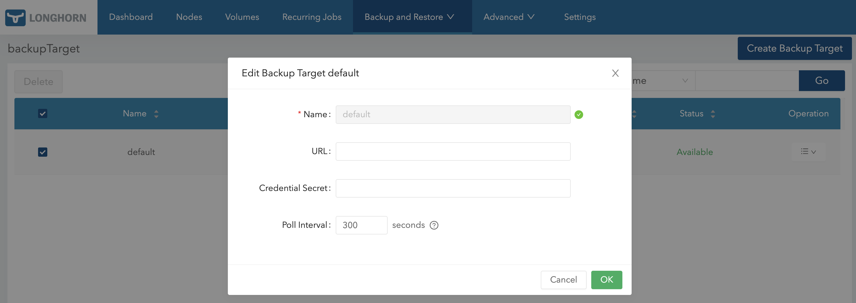 5. Go to the Longhorn UI. In the top navigation bar, click Backup and Restore/Backup Targets, and create or edit a backup target.